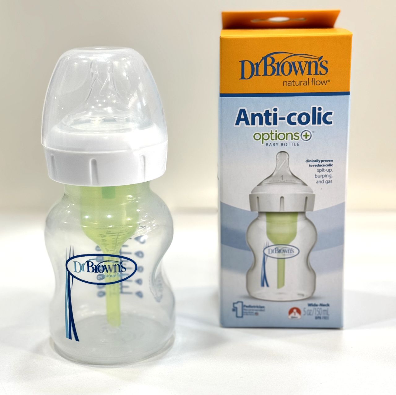 شیشه شیر طلقی ۱۵۰ میل «دکتر براون» با سرشیشه یک قطره (شماره ۱)،  که از بدو تولد برای تغذیه نوزاد مناسب است و با فناوری ضدنفخ دوگانه، از ورود هوا به شکم کودک و بروز نفخ و رفلاکس جلوگیری می‌کند و مواد مغذی شیر را حفظ می‌نماید