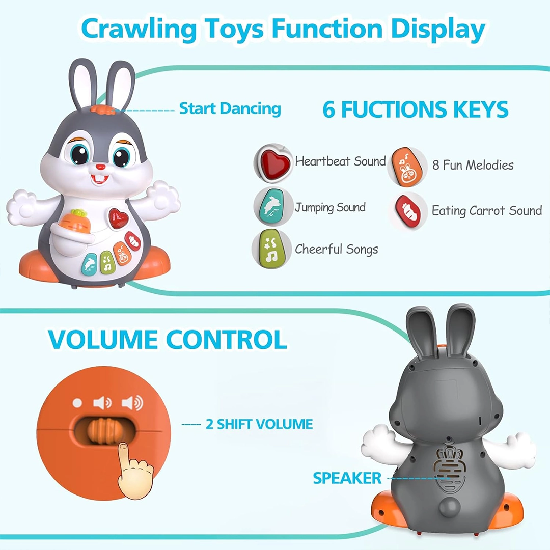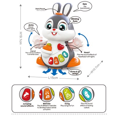 دکمههای رنگی روی بدن خرگوش ۸ ملودی مختلف به همراه آهنگ پخش میکنند که به برانگیختن حواس شنیداری کودک نیز کمک میکند. همچنین دارای افکتهای صوتی مانند صدای خوردن هویج و صدای پریدن خرگوش نیز میباشد. با فشار دادن دکمهی قلب، چراغ آن روشن و صدای تپیدن قلب پخش میگردد و با زدن بر روی هویج نیز افکتهای صوتی بامزهای برای کودک به صدا درمیآید.