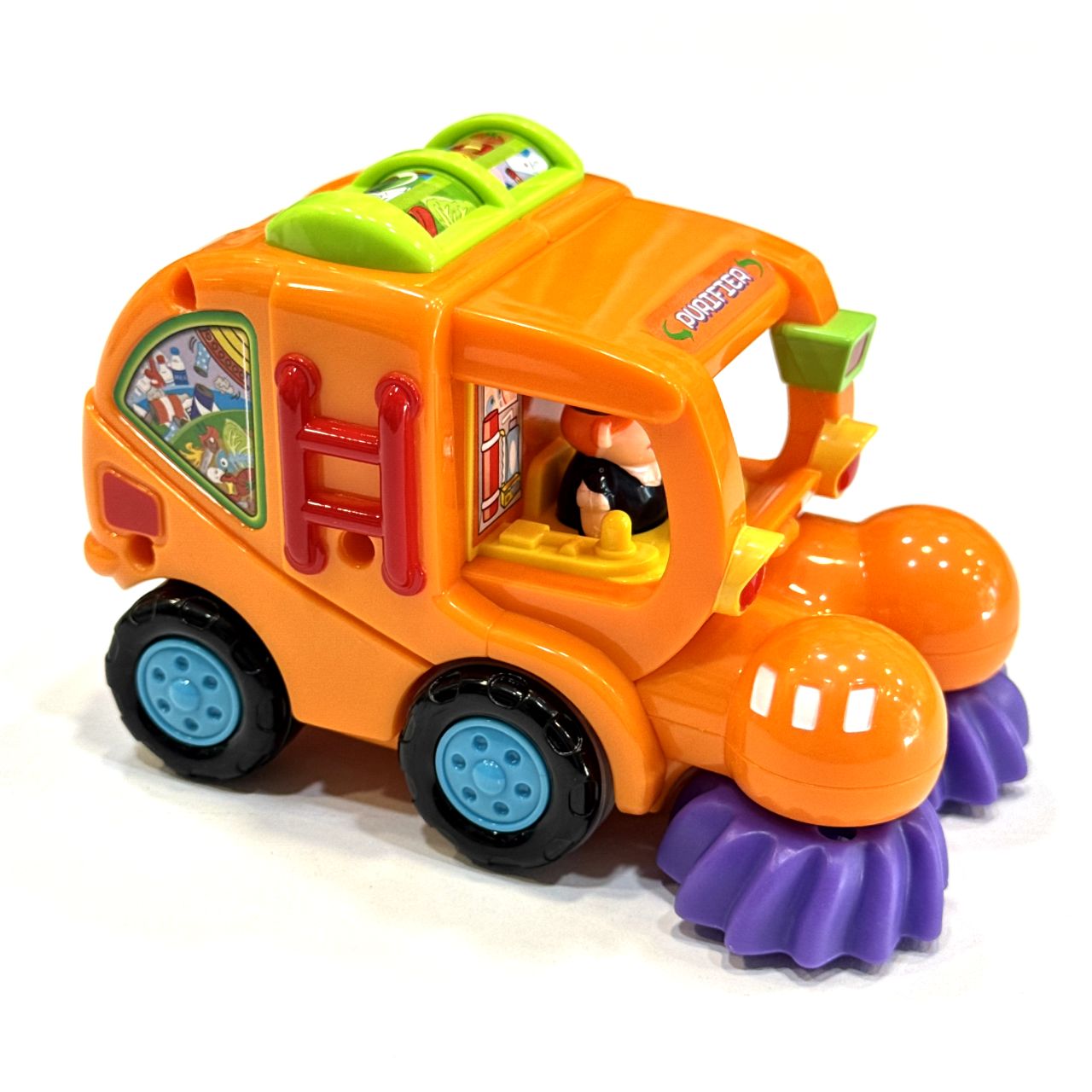 ماشین جاروکش شهرداری نارنجی رنگ بر روی سقفش استوانه ای دارد که گردان بوده و زیر آن نقاشی هایی عروسکی دیده می شود. به جای چرخهای جلو فرچه هایی وجود دارد که هنگام راه رفتن فرچه ها می چرخند.