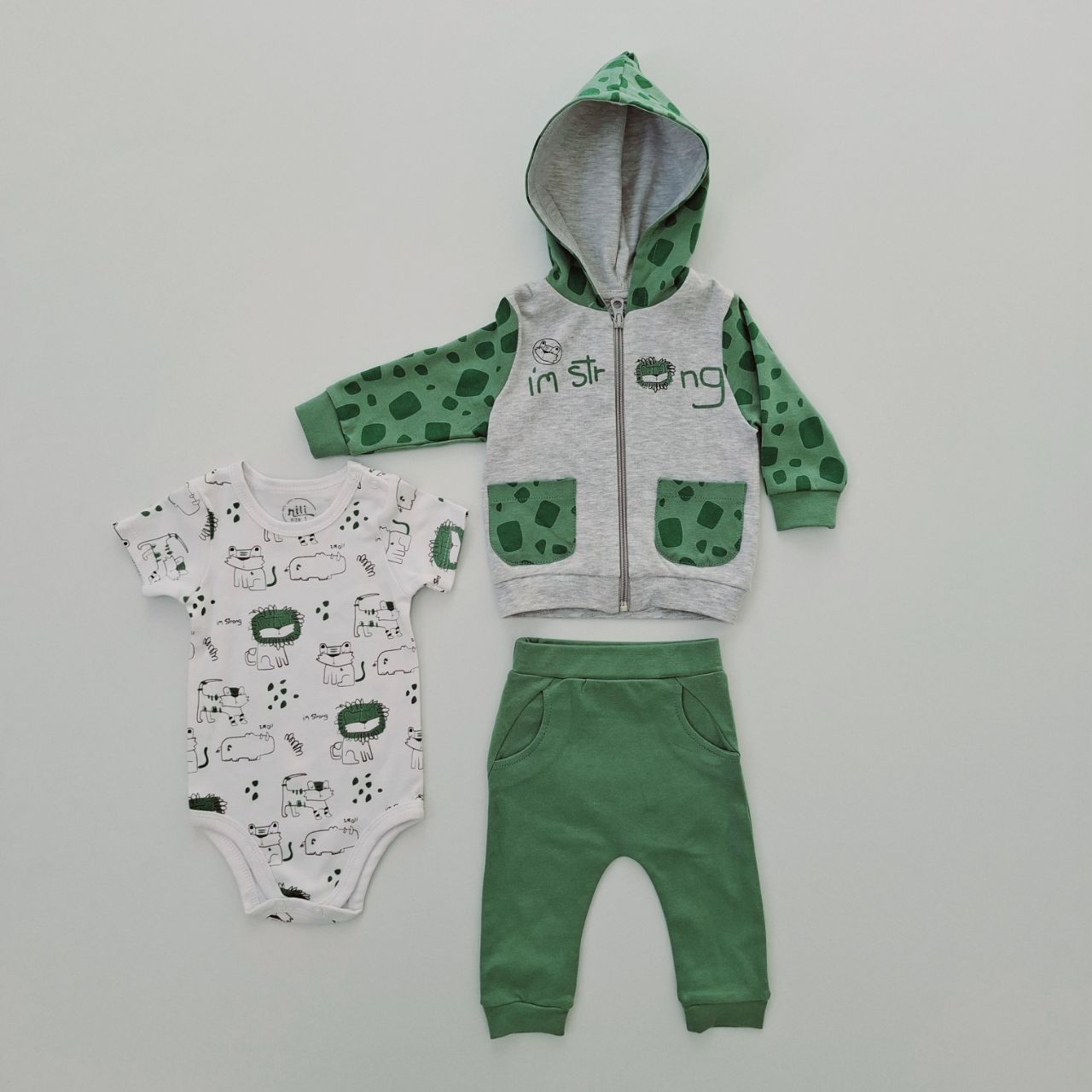 ست لباس سه تیکه پاییزی از برند ایندیگو شامل سویشرت بادی آستین کوتاه و شلوار .جنس پارچه ۱۰۰٪ نخ پنبه.سایزبندی از ۰تا۱۸ ماهگی