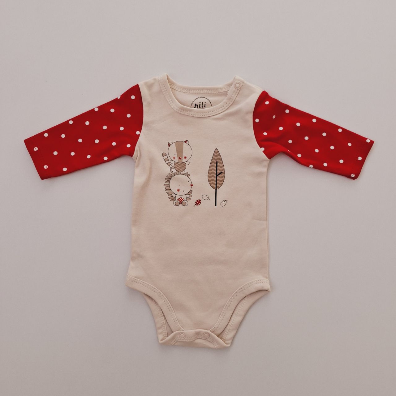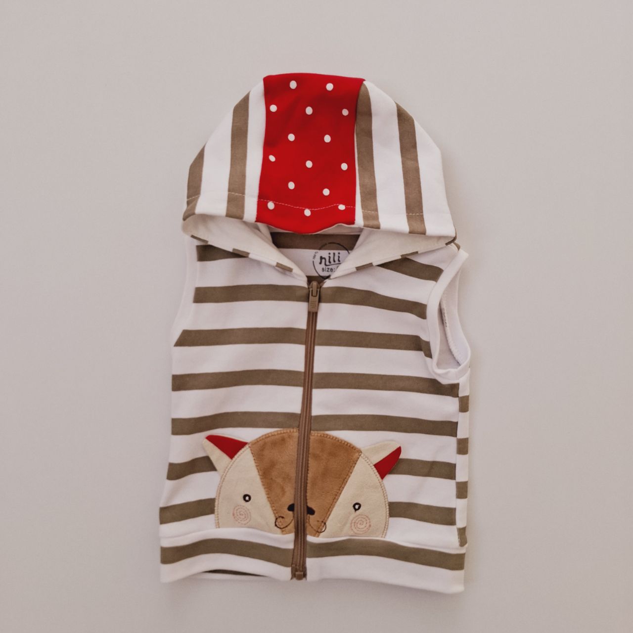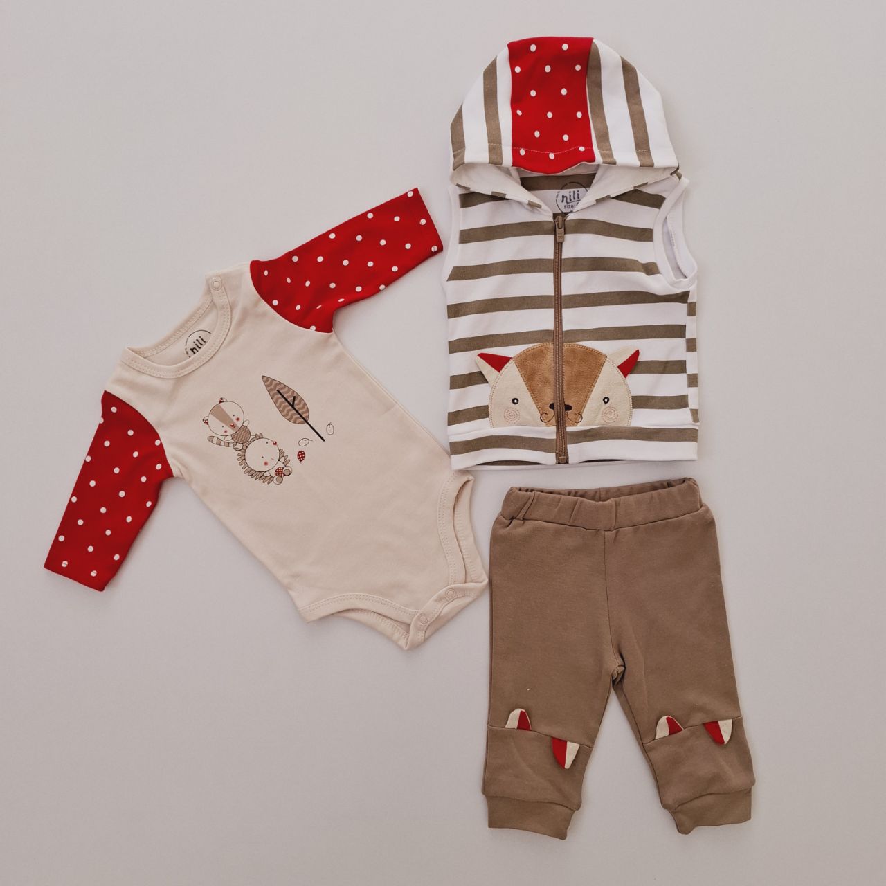 ست لباس سه تیکه پاییزی از برند ایندیگو شامل ژیله بادی آستین بلند و شلوار .جنس پارچه ۱۰۰٪ نخ پنبه.سایزبندی از ۰تا۱۸ ماهگی