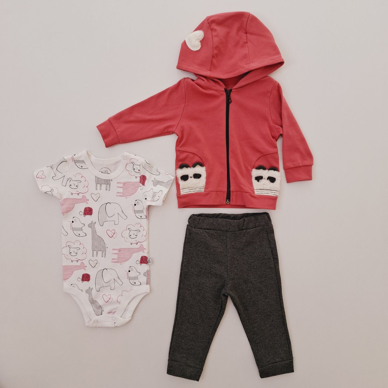 ست لباس سه تیکه پاییزی از برند ایندیگو شامل سویشرت بادی آستین کوتاه و شلوار .جنس پارچه ۱۰۰٪ نخ پنبه.سایزبندی از ۰تا۱۸ ماهگی