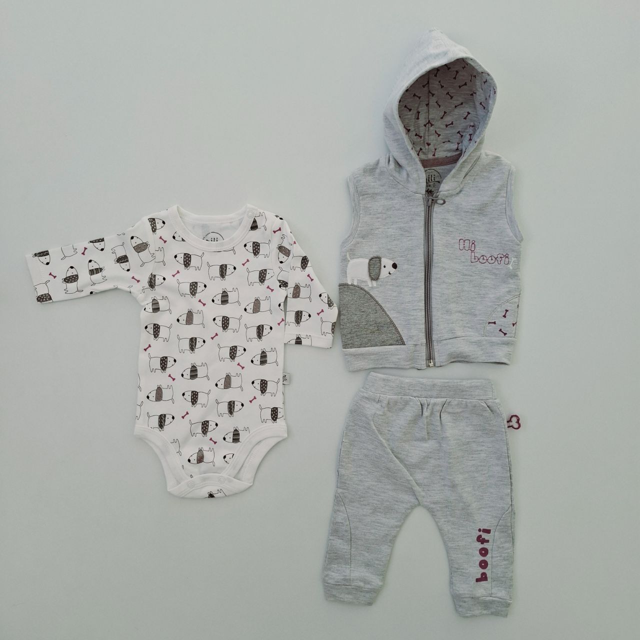 ست لباس سه تیکه پاییزی از برند ایندیگو شامل ژیله بادی آستین بلند و شلوار .جنس پارچه ۱۰۰٪ نخ پنبه.سایزبندی از ۰تا۱۸ ماهگی